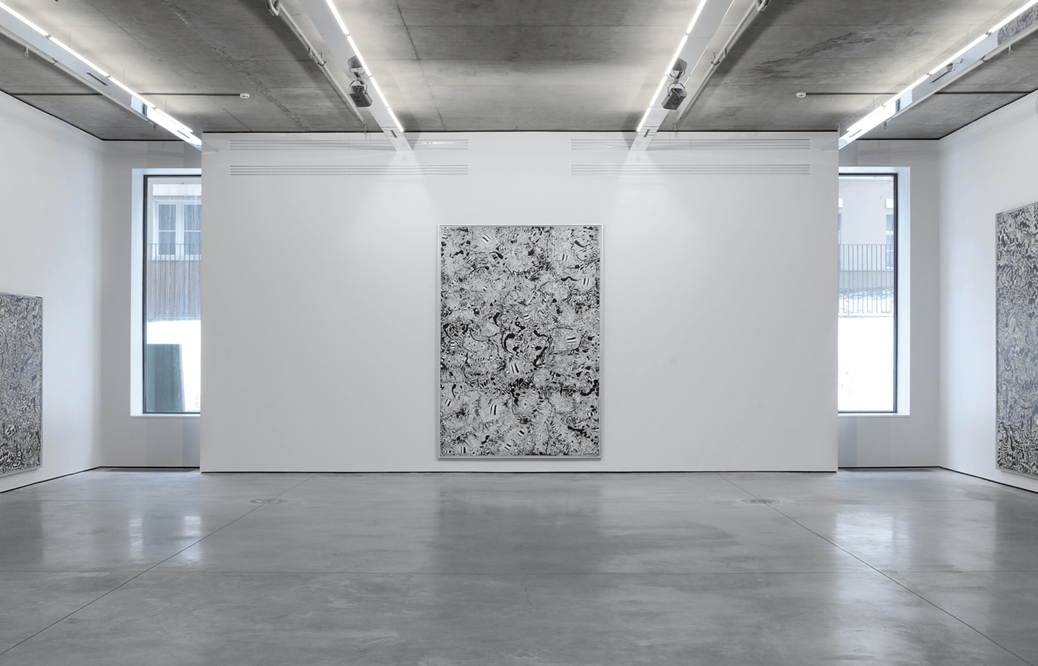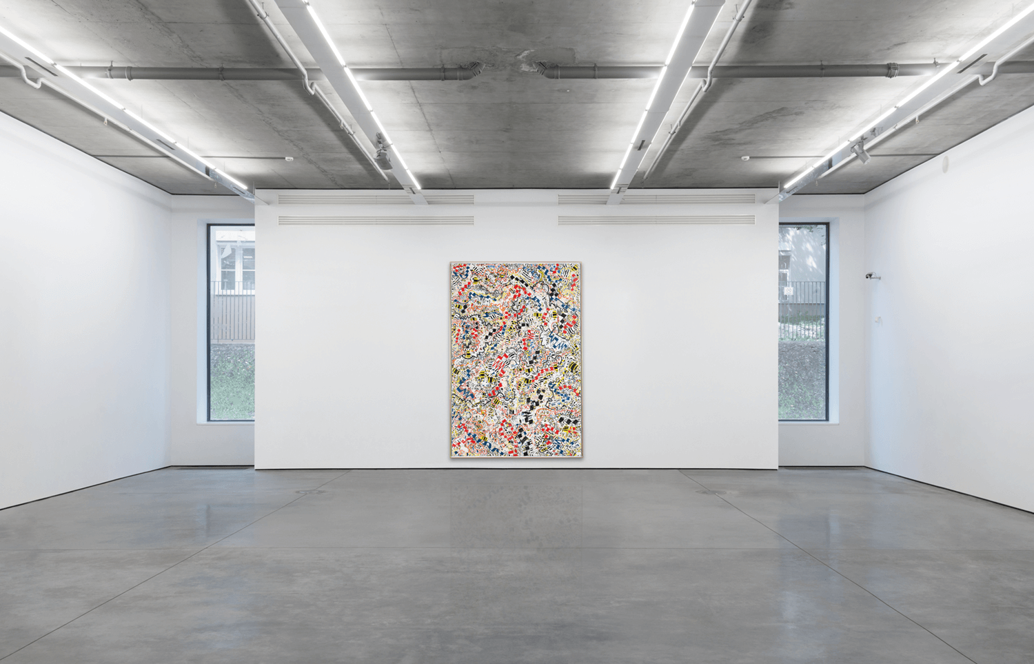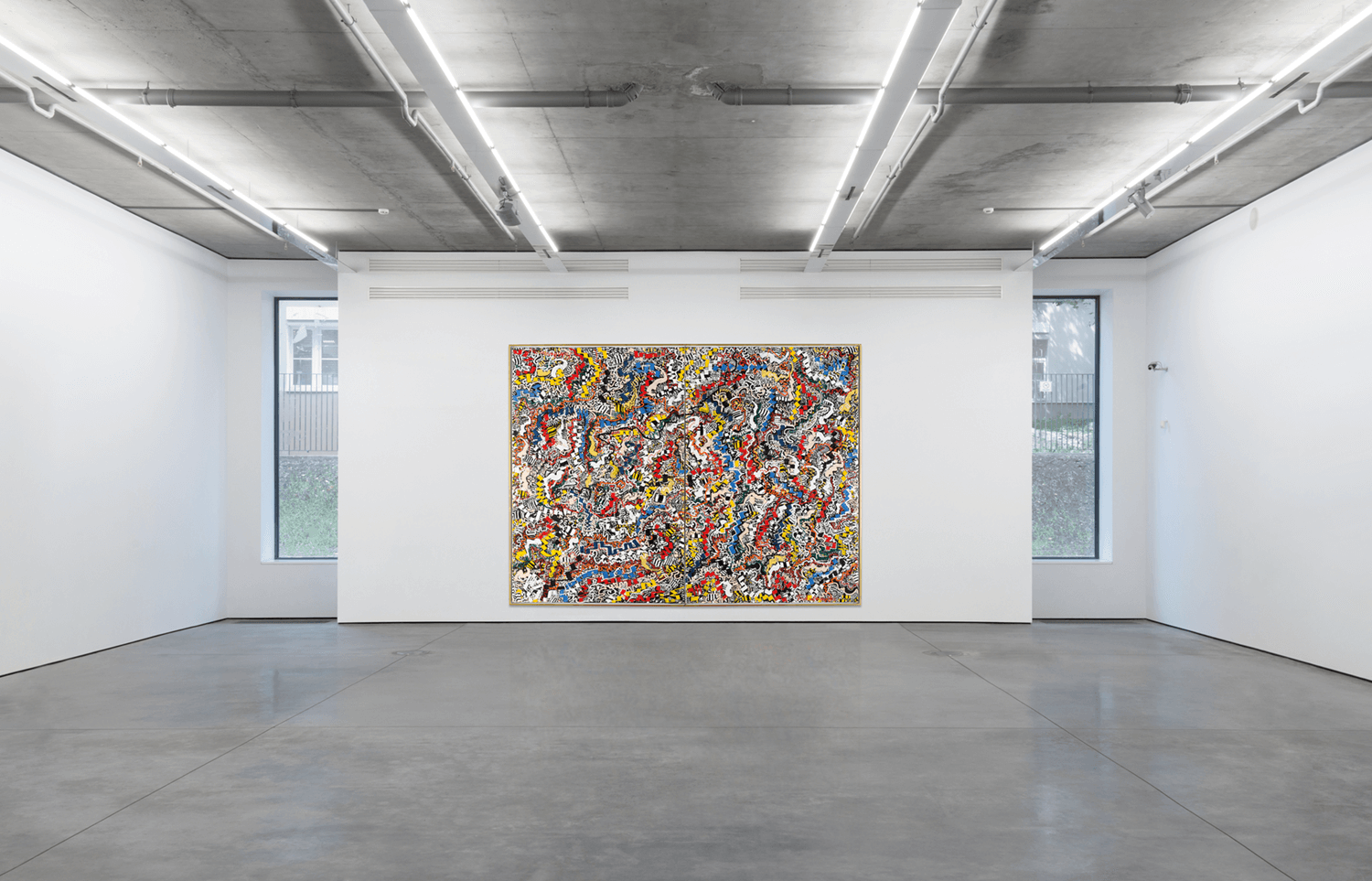 At times, there are round lines that extend from one side to the other. Then again, there are more powerful and larger interplays of lines that frame the first layer. Added to this are small rectangular, square and triangular black color juxtapositions that are strung together. The results are these large-scale and magnificent paintings that create a totality of imagery.
